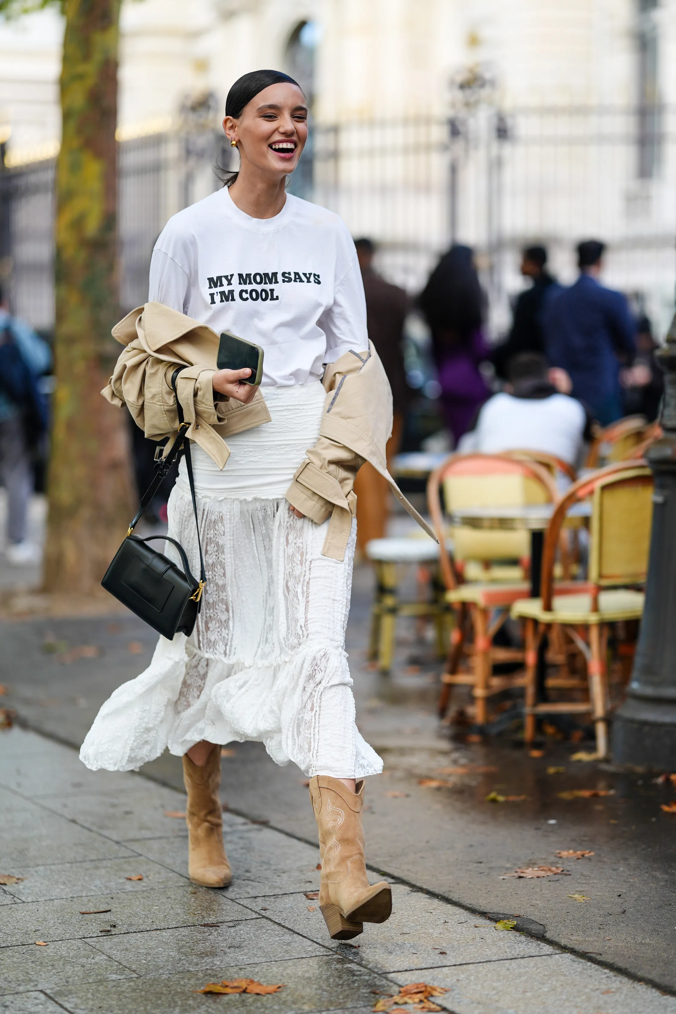 Street style documentation from international fashion weeks reveals diverse interpretations across cultural contexts. Copenhagen Fashion Week Spring 2025 featured oversized gradient-printed tees paired with fluid silk midi skirts in complementary tones—creating harmony through color story while introducing tension through contrasting textures. Tokyo interpretations featured fitted graphic tees with technical fabric mini skirts and utility accessories, demonstrating urban functionality through waterproof materials and adaptable construction. These global variations show how cultural context influences the foundation combination while maintaining its essential versatility.