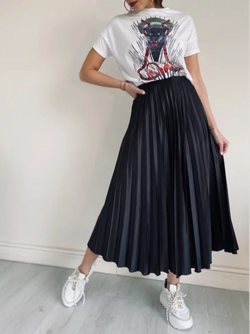 The relationship between midi skirts and t-shirts hinges on creating intentional balance. Full-circumference pleated midis pair harmoniously with more fitted tees that create clear distinction between the structured lower volume and the streamlined upper body. The substantial weight of Awcaseus t-shirts prevents the bunching that often occurs with lighter fabrics when tucked into waistbands, resulting in a cleaner line.