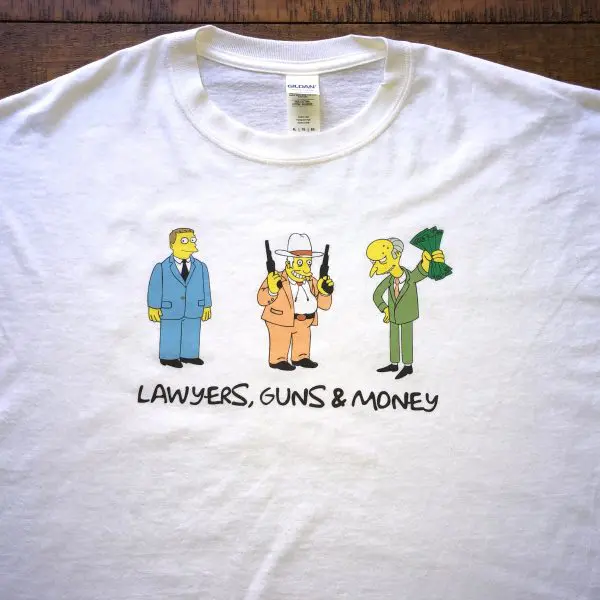 “Lawyers, Guns & Money” isn’t just a lyric—it’s a rally cry. An homage to Warren Zevon’s rebellious spirit, a satirical punch to the ribcage of greed, control, and capitalism’s favorite tools. Paired with pop culture characters that echo absurd power structures, this shirt says what you’re thinking without you having to say a word. It’s humorous on the surface, but under it lies the layered exhaustion of living in a world upside down.