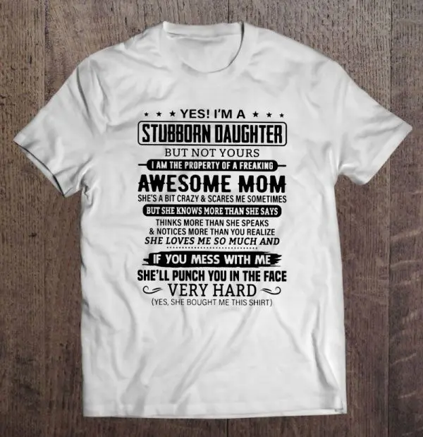 Yes I’m A Stubborn Daughter But Not Yours I Am The Property Of A Freaking Awesome Mom She’s A Bit Crazy high-quality shirts with great designs from awesome mom, Bit Crazy, Daughter, MOM, Stubborn Daughter